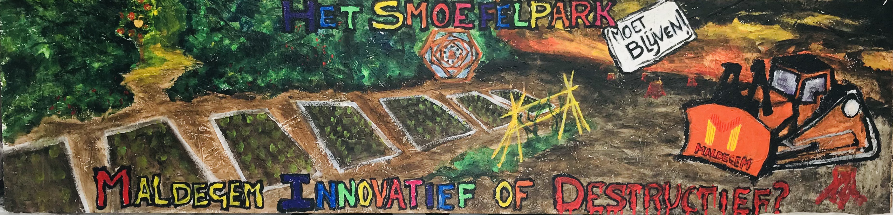 Protest sign made and sponsored for the volunteer association ' t Smoefelpark for the preservation of the eponymous biological and public picking garden in the Sint Annapark in Maldegem (BE)